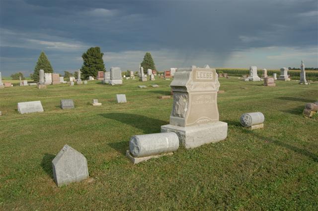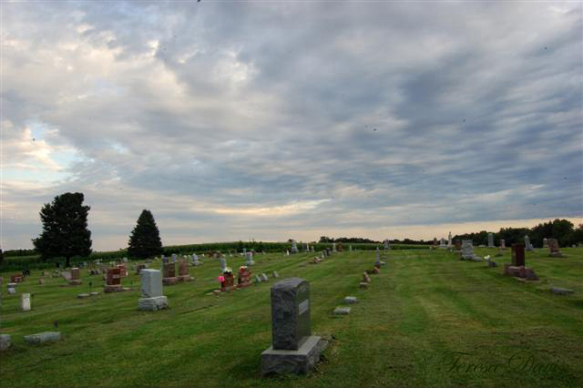 Harlan Cemetery just before a storm. As I stood there a flock of birds swirled overhead almost as if playing in the wind, to and fro. Most likely they were catching and eating the abundant crop of insects, as in, mosquitoes that were in the air. For some reason, they were only above the cemetery, not the fields as I would have expected.