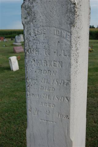 Marken, Bessie Ione, Dau of J. H. & I. L. Marken, Born 31 Mar 1897, Died 31 May 1898, Aged 1 Yr 2 Ms.