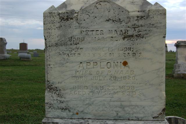 Naab, Peter, Born 22 Mar 1815 In Schwabsburg, Province of Rhine, German, Died 15 June 1898, Aged 83 Y's 3 M's 24 D's Applonia, Wife of P. Naab, Born 20 June 1820, In Schwaburch Province of Rhine, Germany, Died 23 Feb 1898, Aged 77 Y's 7 M's 3 D's
