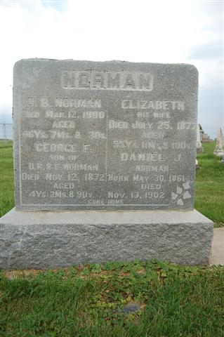 Norman, D. B., Died 12 Mar 1900, Aged 66 Ys 7 Ms & 3 Ds Elizabeth, His Wife, Died 25 July 1877, Aged 55 Ys. 11 Ms & 10 Ds Norman, George E., Son of D. B. & E. Norman, Died 12 Nov 1872, Aged 4 Ys 2 Ms & 9 Ds Norman, Daniel J., Born 30 May 1861, Died 13 Nov 1902 Gone Home