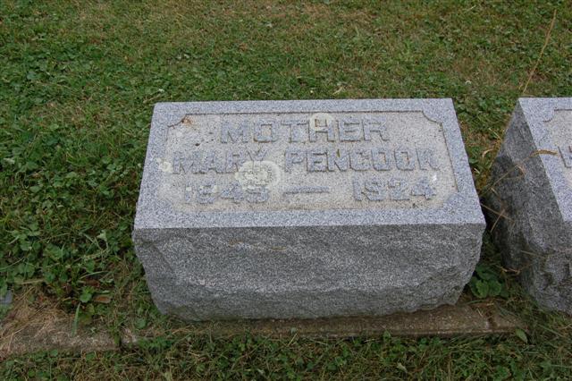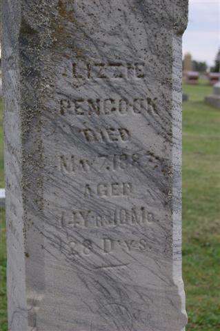 Pencook, Lizzie, Died 7 May 1887, Aged 14 Y'rs 10 Mo. 28 D'ys. We miss thee, from our home dear We miss thee from thy place A shadow over our lives is cast We miss the sunshine of thy face.